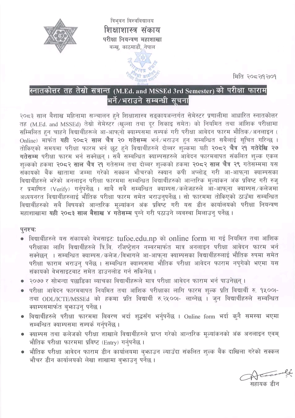 Notice regarding filling up the exam form for M.Ed. / MSSEd. 3rd Semester 2082
