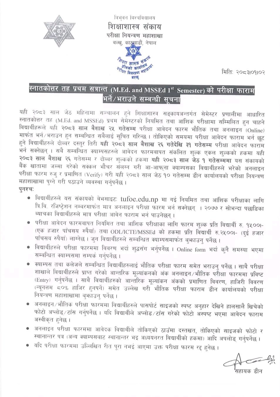 Notice regarding filling up the exam form for M.Ed. and MSSED 1st Semester 2083