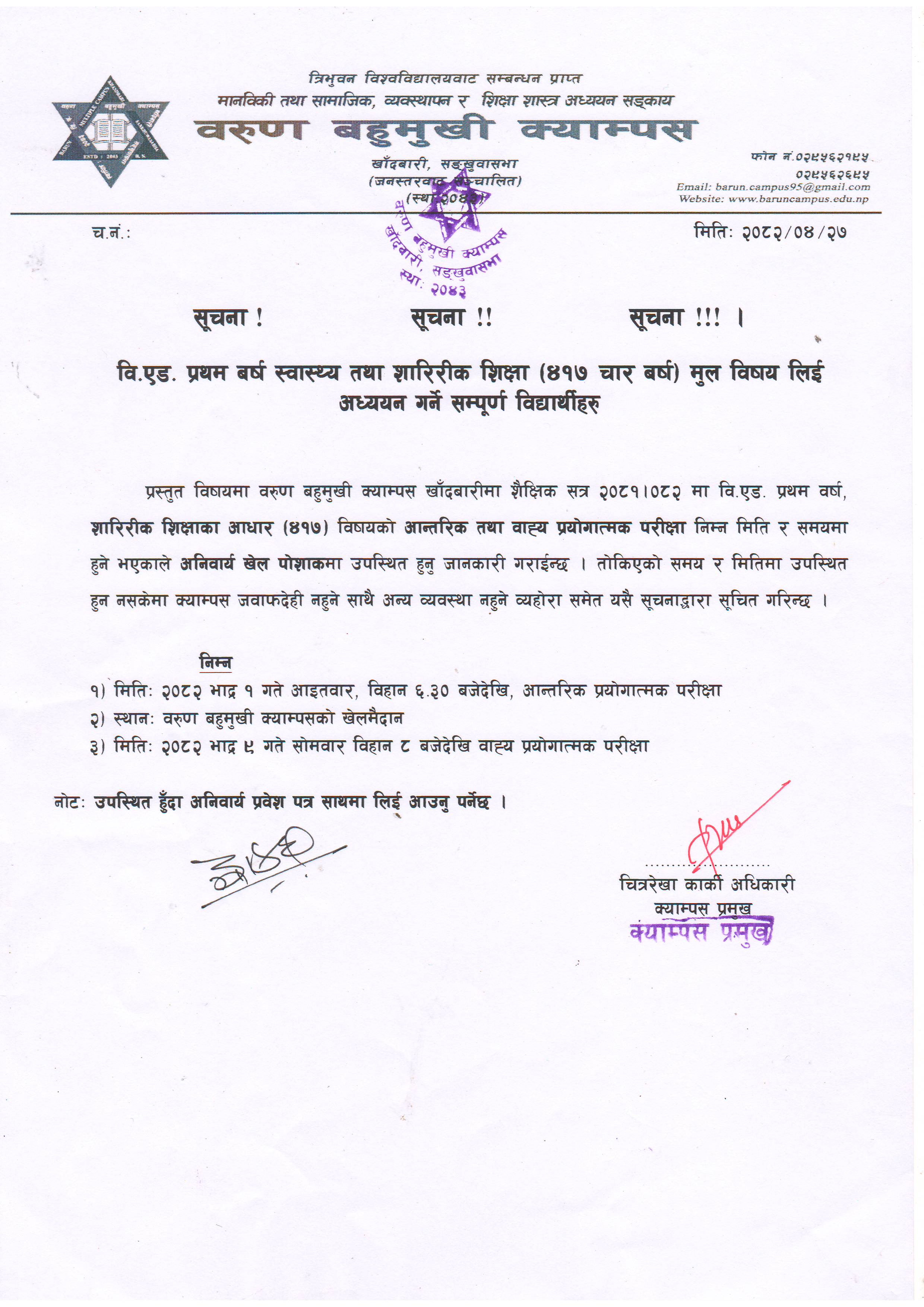 рд╡рд┐.рдПрдб. рдкреНрд░рдердо рд╡рд░реНрд╖, рд╢рд╛рд░рд┐рд░реАрдХ рд╢рд┐рдХреНрд╖рд╛рдХрд╛ рдЖрдзрд╛рд░ (рекрезрен) рд╡рд┐рд╖рдпрдХреЛ рдЖрдиреНрддрд░рд┐рдХ рддрдерд╛ рд╡рд╛рд╣реНрдп рдкреНрд░рдпреЛрдЧрд╛рддреНрдордХ рдкрд░реАрдХреНрд╖рд╛ рд╕рдореНрдмрдиреНрдзреА рд╕реВрдЪрдирд╛ ред