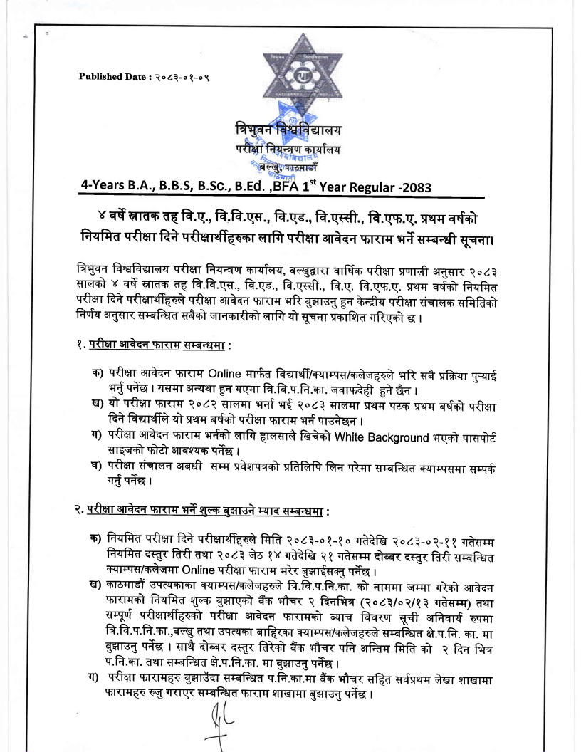 23, Apr 2026 | 4-Years B.A., B.B.S, B.Sc., B.Ed., BFA 1 Year Regular Form Fill-up Notice -2083